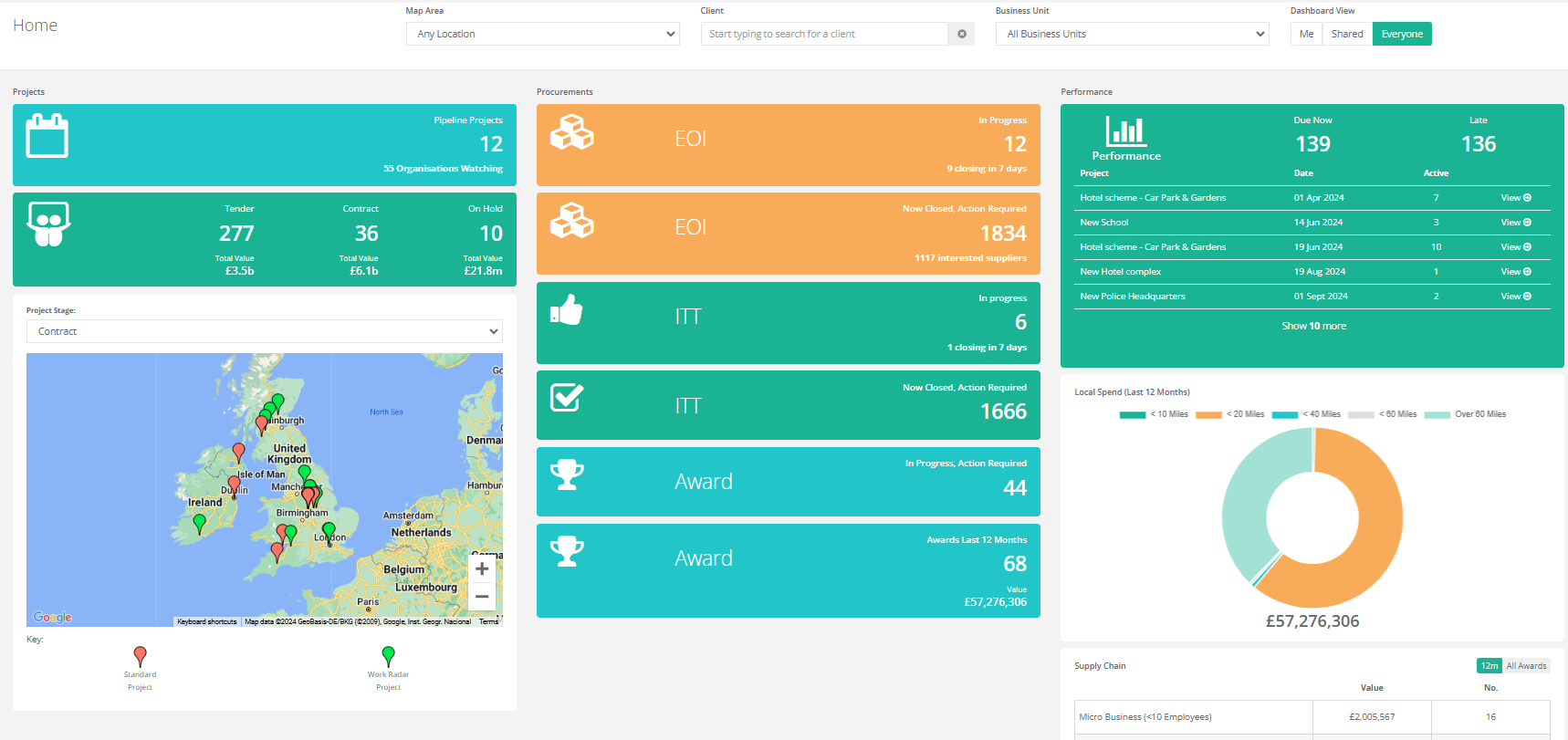 Provides an overview of projects for your chosen view. The screen displays the number of projects at Pipeline, Tender, Contract and on hold with a map view to display all projects