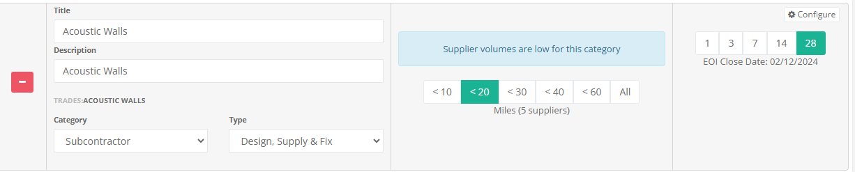 3) Configure you EOI by selecting the radius (in miles) from the project to include suppliers as well as how long this EOI will stay live