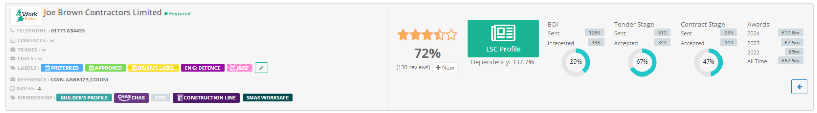At a first glance each supplier has a list of information unique to your business, you can see which labels are linked to the business, your performance scoring as well as the dependency percentage to your business (this is based on the value of awards you have given them and their financials figures.