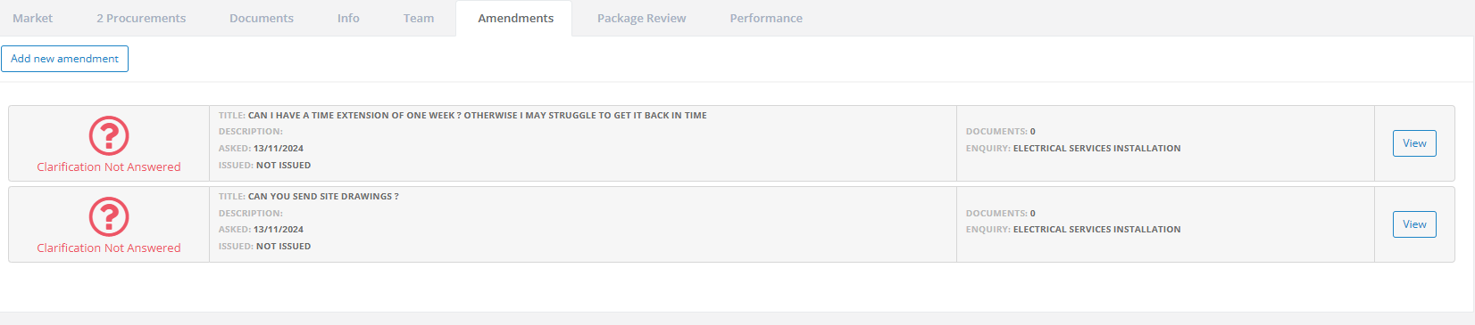 Clarifications are where sub contractors can ask questions about the project; this could be regarding more documents or time extensions. You will be notified when a clarification is sent to you by email, to access them, go to your project page and select 'amendments' on the top bar