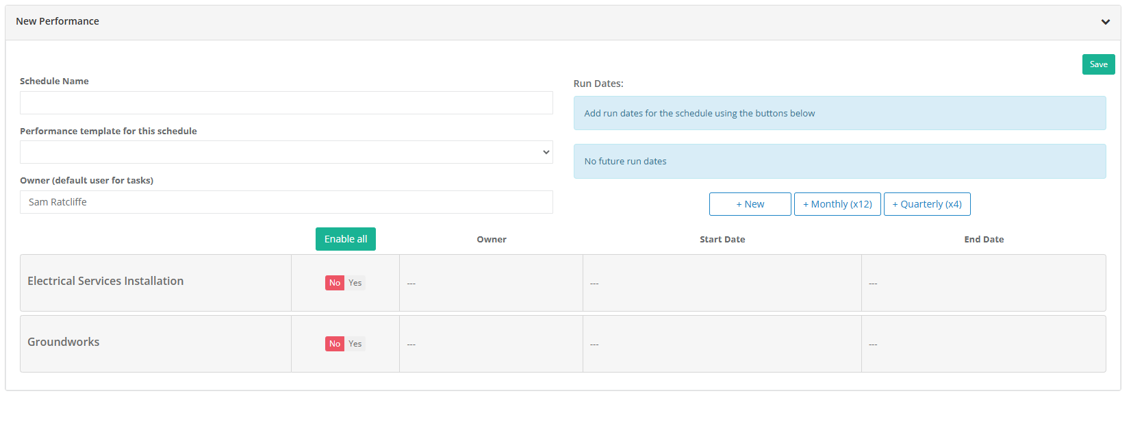 On the left you can give the schedule a specific name. Select a performance template. the person creating the performance will automatically become the owner, but you are able to edit this. On the right is where you can create a schedule, there are pre-selected schedules of 12 months/Quarterly and a blank +new.