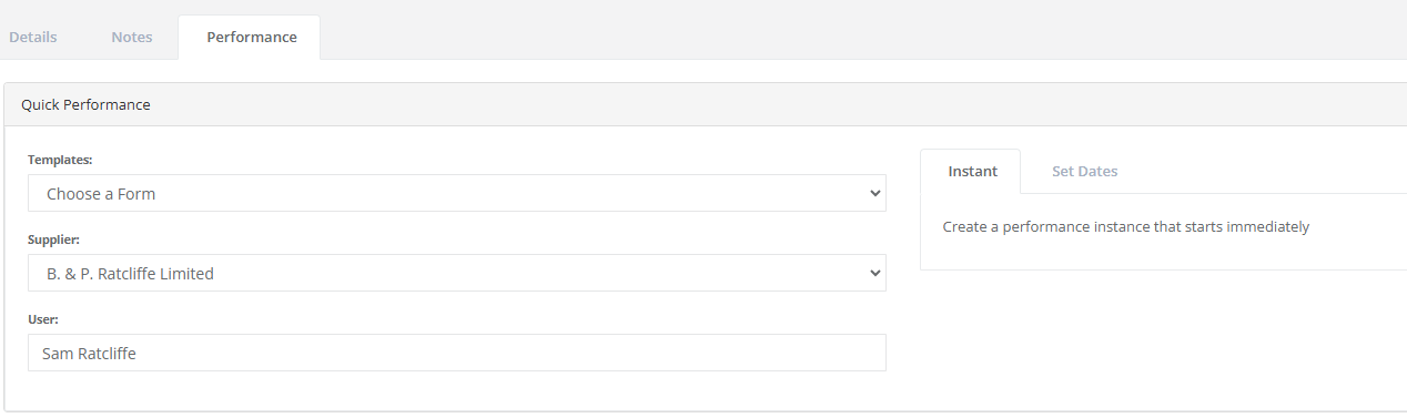Once the Performance page has loaded you will be able to select which performance scoring sheet you wish to send and if you have the correct role, you can change who scores it